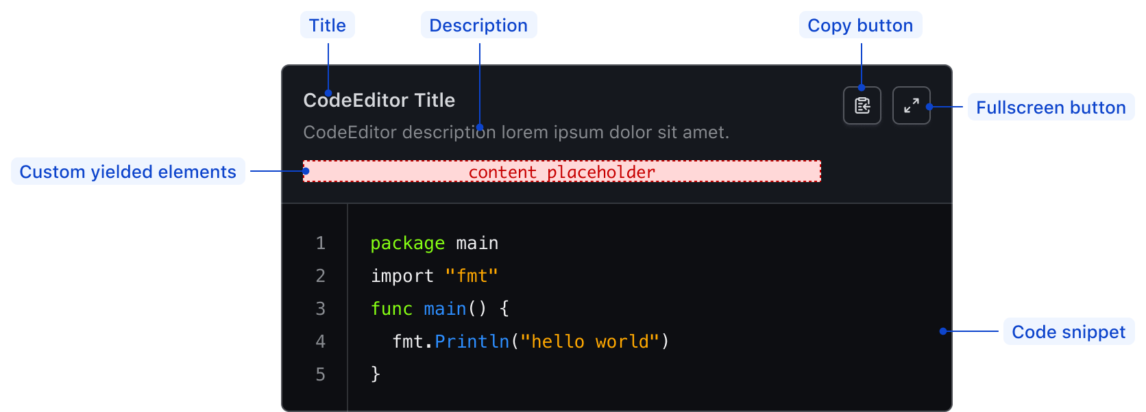 Optionally, you can pass a title and/or a description using the [CE].Title and [CE].Description components yielded by the Code Editor component.